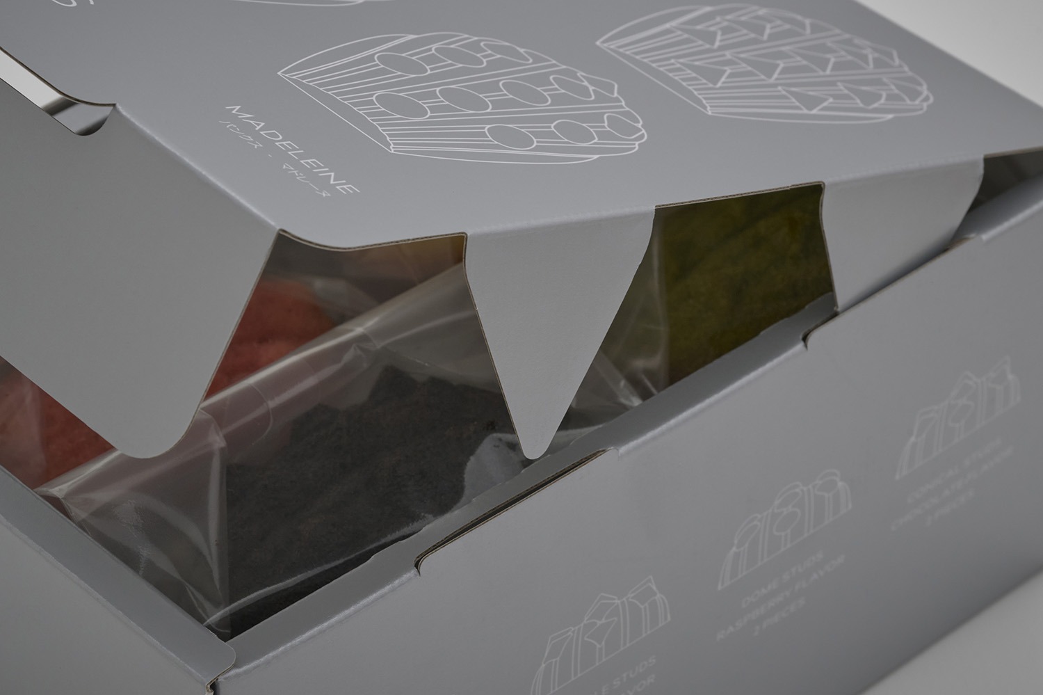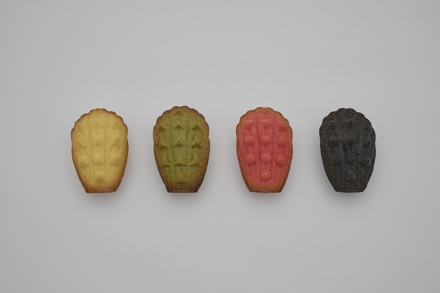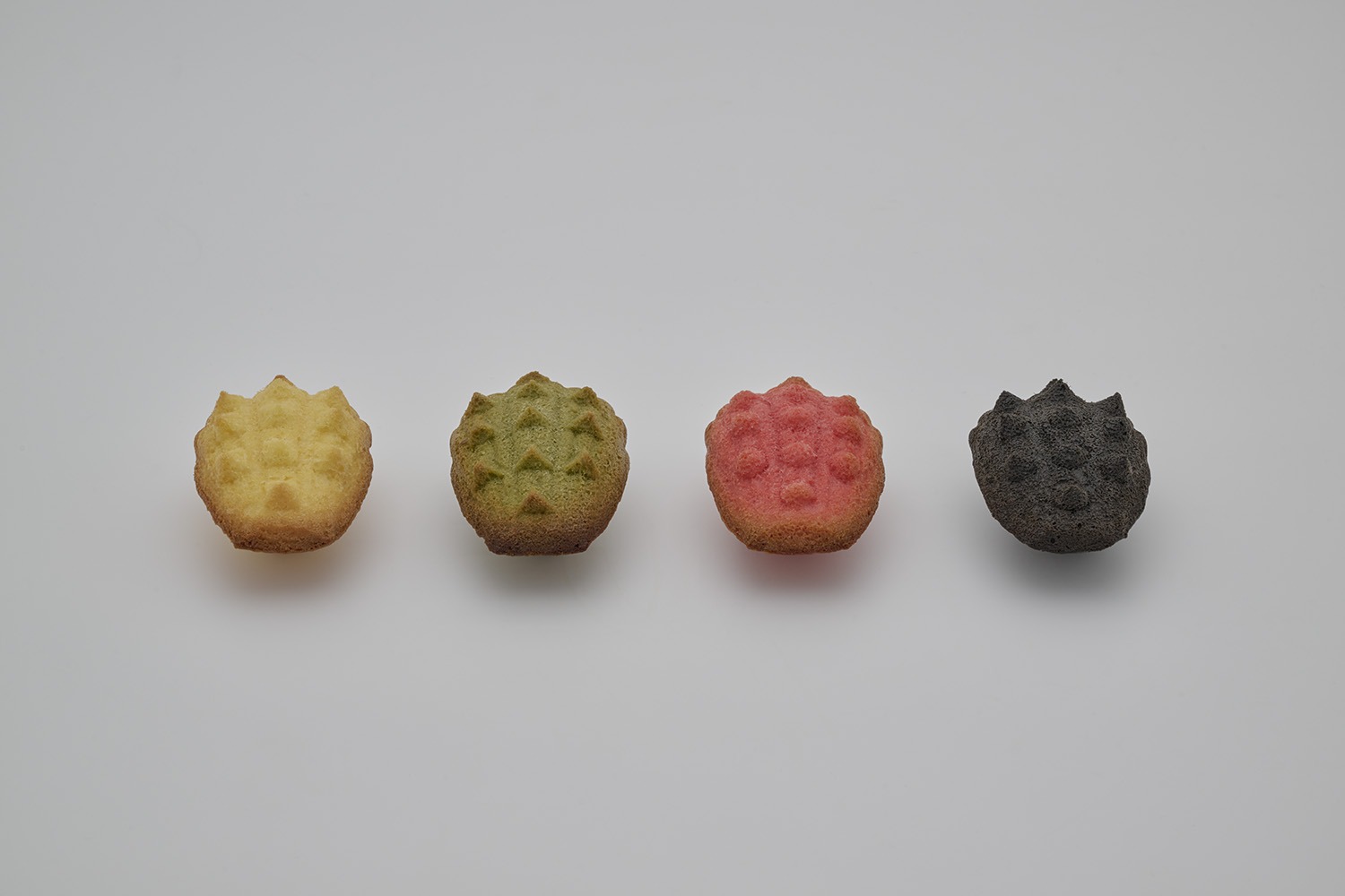 プレーン味にはピラミッド型、抹茶味にはトライアングル型、ラズベリー味にはドーム型、チョコレート味にはコニカル型のスタッズがそれぞれ施されています。