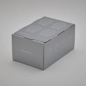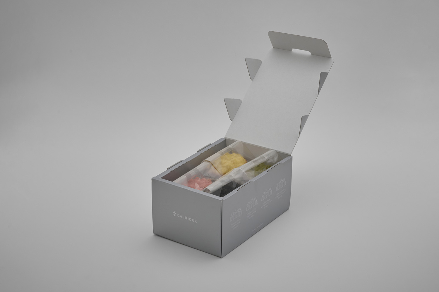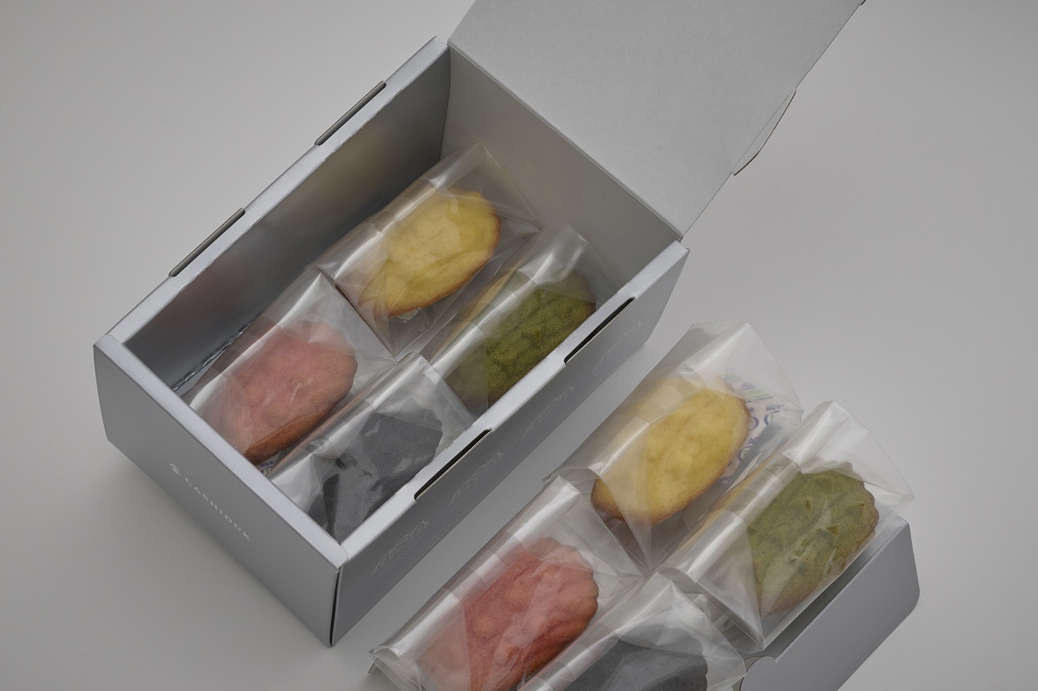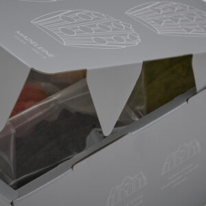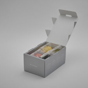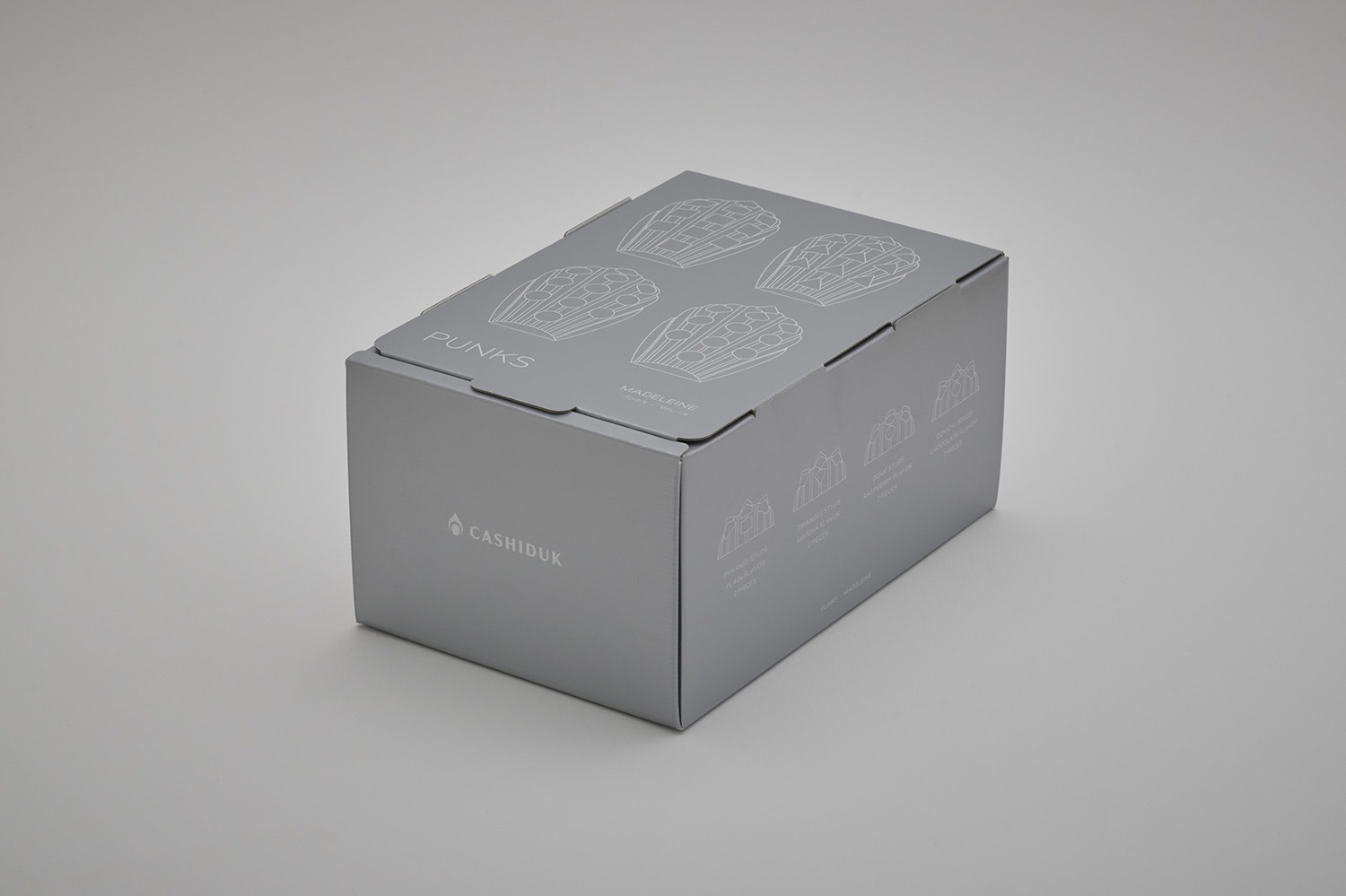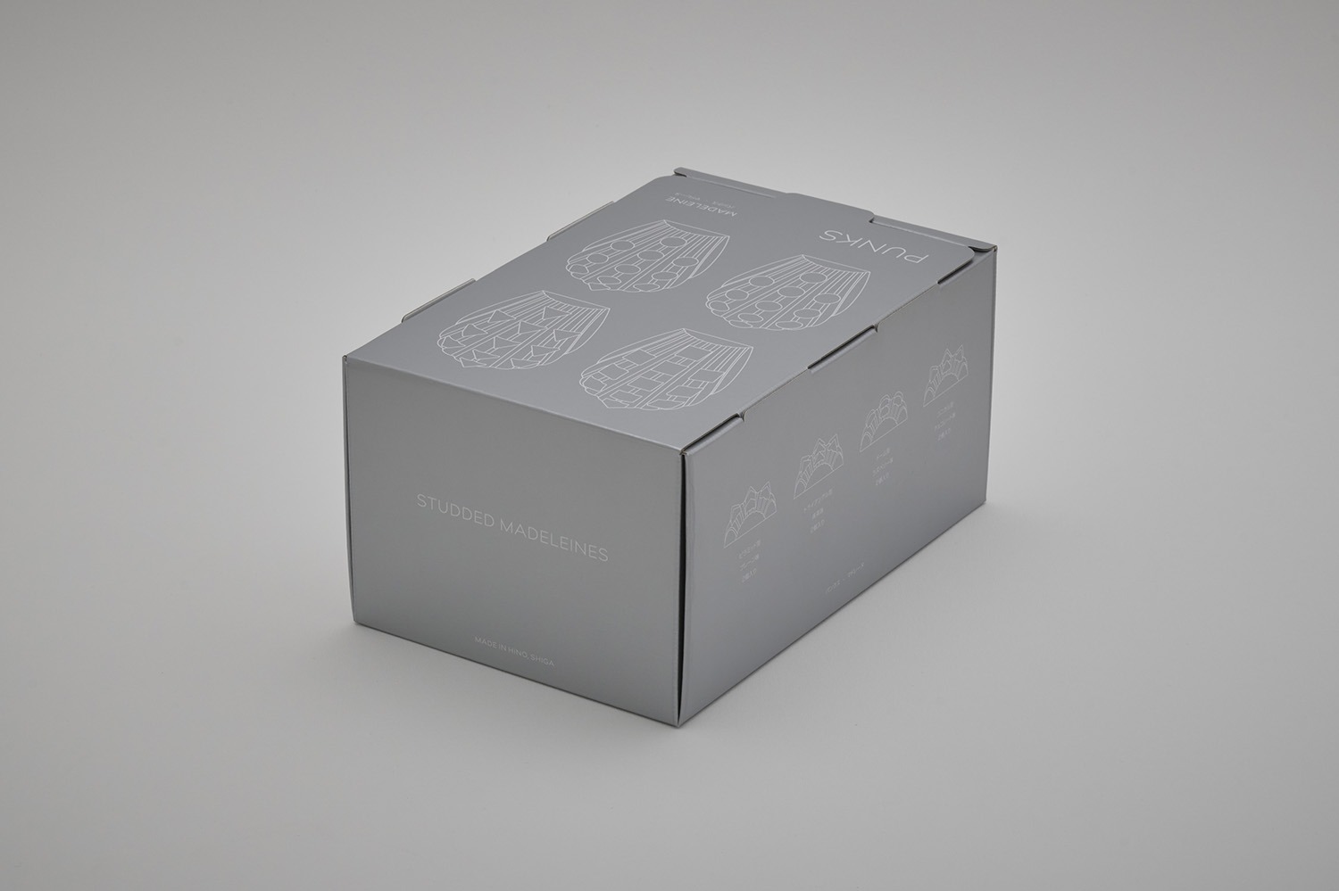 パッケージはスタッズの金属感を表現したシルバー1色のデザインになっています。蓋にはスタッズを想起させる4つの差込みがあり、箱をしっかりと閉じてくれます。お菓子は二段に分かれて入っており、4種の味各1個ずつ上と下の段に分かれて入っています。